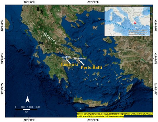 Map of Greece showing the sample collection site (Porto Rafti: N 37° 52ʹ 57.1ʺ, E 24° 00ʹ 51.1ʺ and Loutraki: N 37° 57ʹ 02.3ʺ, E 22° 57ʹ 37.7ʺ).