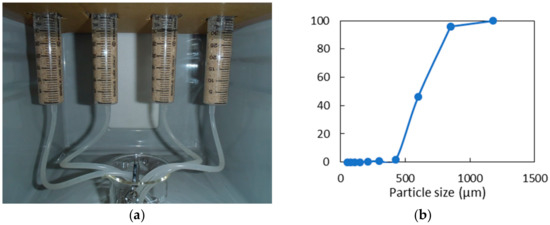 Then, 40 g of dried (110 °C for 2 days) Mikawa sand was loaded in a 35 mL syringe (height: 7 cm and diameter: 2.5 cm). Subsequently, 16 mL of the bacterial culture solution (ZoBEll2216E) and 20 mL of the consolidation solution (Table 3) was serially injected into the syringe showing in Figure 2a. The syringe was flushed after 2 h, leaving approximately 2 mL of the solution close to the surface of the sand. The consolidation solution was injected and drained every day for 21 days. The testing conditions are presented in Table 4. The pH values and Ca2+ concentrations from the outlet were measured afterwards. The condition of the syringe solidification test and grain size distribution of Mikawa sand is presented in Figure 2b. After 21 days, the UCS of the sample was measured by a needle penetration device (SH-70, Maruto Testing Machine Company, Tokyo, Japan).