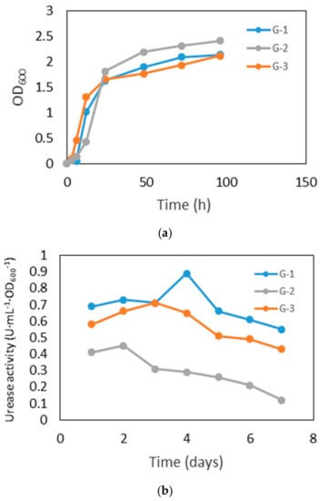 It was shown that the urease activity of the bacterial whole cell, cell pellet, and supernatant was closely related to the presence of protease in the cell [25]. However, it is well established that urease activity of different bacteria species depends on each species, as well as some environmental factors, which is similar to this study. Earlier studies have also reported that the urease from a few species such as Pararhodobacter sp. Appeared to have very high stability with extensive cultivation [26]. However, our results revealed that the G2 species of bacteria showed a dissimilar tendency for urea hydrolysis even under extended cultivation compared to the G1 and G3 species. The possible reasons for varying the urease activity might be osmotic pressure and resuspension of the cell, which might release enzyme into the solution from cells. However, further study needs to investigate the actual reasons.