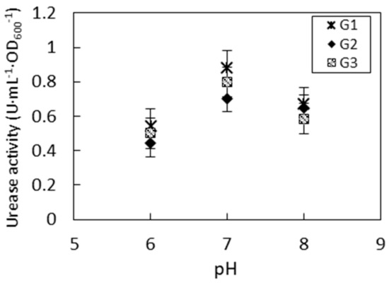 Following the same conditions, the G1 species showed the highest urease activity compared to the G2 and G3 species. Previous research showed that the MICP process favored an initial pH environment of 6.5–9.3 (neutral to basic condition). Additionally, it was revealed that, in the case of some species such as Pararhodobacter sp., considerable loss of urease activity was observed with acidic (lower than pH 6) and alkaline (higher than pH 9) conditions attributed to denaturation of protein [24]. It was also reported that the urease activity of some ureolytic bacterial species favored lightly alkaline conditions [25,26,27]. Thus the pH value played an important role for the bacteria transportation and adhesion to obtain homogeneously improved strength of treated soils. Therefore, the results of this study could also be useful information for obtaining a successful sand solidification process for identifying the optimum pH condition for native species.