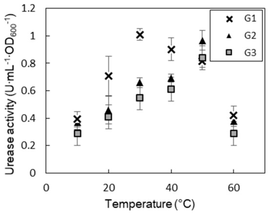 Urease activity with various temperature conditions is shown in Figure 5 for the G1, G2, and G3 species. High urease activity was observed at a temperature above 30 °C (G1 species) and then gradually decreased and showed an almost bell-shaped profile because of cell denaturation at a higher temperature, except in the case of G2 and G3 species. The divergent tendency of urease activity (nearly 40–60 °C) was also observed by Fujita et al. [26]. However, there are few data about the urease activity of marine ureolytic bacteria in Greece. Even though the urease activity of G1, G2, and G3 species are lower than that of Pararhodobacter sp., the results obtained in this study would be innovative and adventitious information for the sand solidification method through microbial carbonate precipitation because the use of native ureolytic species (isolated from marine area). In future, it may be possible to use G1, G2, and G3 species for sand solidification, which could help to manufacture artificial beachrock following the MICP technique. This result could also be adventitious in Greece for coastal erosion control purposes by increasing bacterial population either by centrifugation and/or urease enzyme extraction by ultrasonication and/or adding bacterial populations several times during the sand solidification process before urease activity completely declined. Similar results were also found for the strains such as Deleya venusta and Pararhodobacter sp. [26,27,28]. Previously, it was also found that urease activity influenced to CaCO3 precipitation at temperatures from 10 to 60 °C, which is similar to the findings of this study. However, the effectiveness of environmental factors on urease activity of the negative species with variation temperatures was not examined. Therefore, on the basis of these experimental findings, the G1, G2, and G3 species showed high urease activity in the different range of temperatures that could reflect the importance of isolating the ureolytic bacterial species from the local environment and their subsequent application for sand solidification and soil improvement.