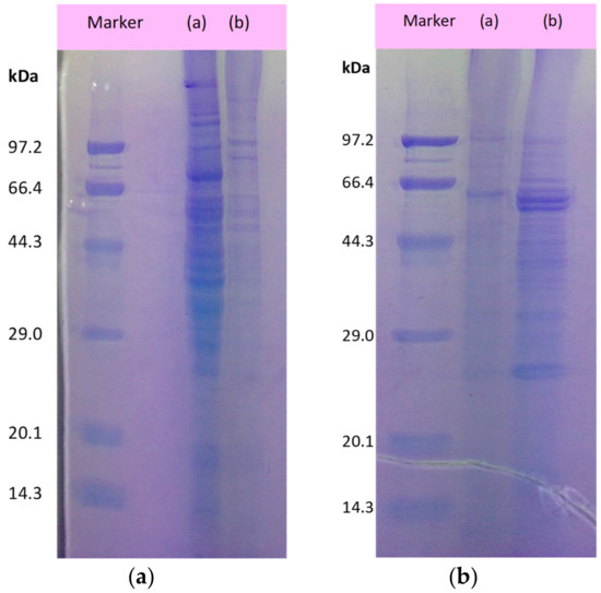 Confirmation of protein (enzyme) expression of the (a) soluble and (b) insoluble portion of bacterial cell lysate of the isolated species.