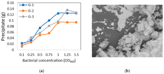 Earlier studies showed that it is possible to control the strength of the treated sand by regulating the amount and/or volume of precipitated minerals. It has also been reported that various environmental factors, including temperature, pH, bacterial size, and cell concentration, control the amount of calcite precipitation during the MICP process [31,32,33]. Therefore, it is very important to investigate the trend in CaCO3 precipitation for individual bacterial species because the CaCO3 acts as the main binder material between the substrate particles for soil improvement during the MICP process. The CaCO3 precipitation trend for the G1, G2, and G3 species is shown in Figure 7a. From the figure, it is clear that CaCO3 precipitation is closely related to the OD600 values, which supports previous studies [34]. From our studies, was also observed that higher OD600 values influenced the CaCO3 precipitation (Figure 7b) amount. Under the same conditions, the G1 and G3 species had the advanced ability of precipitating a higher amount of CaCO3 compared to the G2, leading to a higher possibility of sand solidification. At the same time, the rate of the precipitated CaCO3 decreased and tended to be constant with a further increase of the bacterial cell concentration. However, this study suggests that the variation in the CaCO3 precipitation trend was related to the bacterial population of individual species, which supports earlier studies.