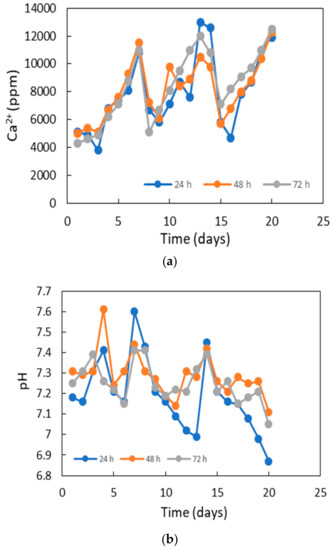 (a) Temporal variation of Ca2+ and (b) pH in the effluent from solidification solution in days.