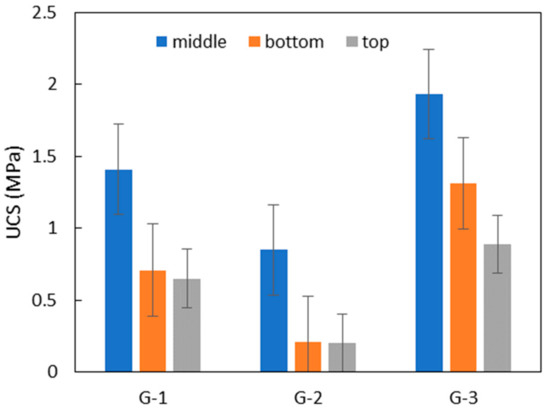 The outcomes of the needle penetration test are summarized individually and shown in Figure 9. From the figure, it was observed that maximum USC around 1.8 MPa was obtained at the middle portion for the G3, G1, and G2 species. The top portion was moderately solidified (UCS around 1.3 MPa) and the bottom portion was solidified bearing UCS around 1.4 MPa (for G3). This was because maximum urea hydrolysis possibly occurred at the middle portion and precipitated crystal might have had more contact point to bind sand particles at this stage [35]. Another reason could be the variation of aerobic and anaerobic conditions in between the bottom portion and beneath the portion of the sample that might be responsible in decreasing the urease activity and/or crystal precipitation. Therefore, further investigation is required to improve the solidification condition.