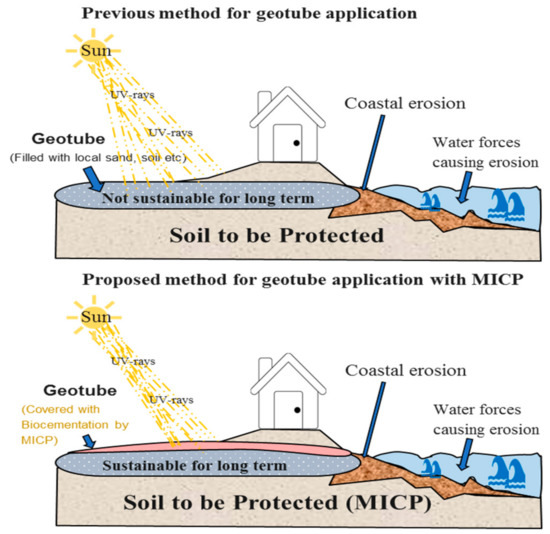 It is well known that the traditional geotubes are widely utilized for flood control, to prevent waterlogging conditions, and for coastal erosion protection. However, all of these conventional methods are not sustainable because of the various of UV rays that come from sunlight damage the geotube after a certain period of time, and protection of soil might be hampered and thus, consequently, the re-installing cost for geotube will be increased [36]. Nonetheless, the re-installing cost could be minimized by using the MICP method and the geotube following our proposed novel approach (Figure 10). By implementing this novel approach, it would be possible to strengthen the coastal structure because the geotube and solidified sand MICP will protect against the UV rays, helping it to remain for a longer period and being more sustainable than the conventional method. In our proposed implementation method, the total cost will be much lower compared to traditional methods, and local ureolytic bacteria will be used, which is more eco-friendly and will ensure long term sustainability of the coastal structures. This method can also be useful in a wider range of civil engineering implementations including paving, construction, and drainage.