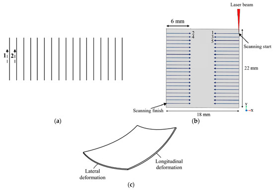 Owing to the thermal nature of the process, the material is affected by several process parameters, particularly by the laser beam parameters and scanning strategy [3]. The effects of laser forming parameters on the bending angle have been numerically and experimentally investigated for a better understanding of the process [1,2,3,4,5,6]. Various studies have been conducted on the microstructural characterization of the materials. Yang et al. [7] investigated the relations between the surface behaviors of the heat-affected zone and laser pulse parameters in laser forming. Zhang et al. [8] compared pulsed- and continuous-wave (CW) laser forming processes on ceramic, silicon, and stainless steel parts, in terms of microstructure. They reported that a larger material damage was caused by the CW laser, compared to the pulsed laser, although a larger bending angle was obtained by the CW laser. Birnbaum et al. [9] reported that repetitious scanning increased the volume fraction of martensitic structure in stainless-steel metals; however, the martensitic volume fraction should be minimized. Abazari et al. [10] performed an extensive study on the microstructural changes in SUS430/C11000/SUS430 composites during laser forming and on the effects of process parameters on the mechanical properties and fatigue life of the composites. In addition, the microstructural changes in laminated metal composites during laser forming have been studied by Seyedkashi et al. [11].