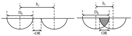 A raster scanning pattern was applied for the laser forming, which involved several sequential scans, as shown in Figure 1a. The applied scanning approach and desired shape are illustrated in Figure 1b,c, respectively. Based on the preliminary experiments, the laser power and scanning velocity were set at 150 W and 3.82 mm/s, respectively, while the dwell time between each irradiations was 2 s [12]. The studied laser bending parameters are illustrated in Figure 2, where hs is the hatch spacing, Db is the beam diameter, and OR is the overlap ratio () [12]. Table 1 summarizes the laser forming parameters used in this study.