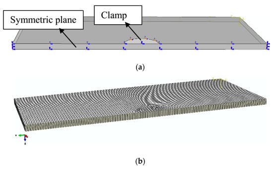 The evaluations of strains and temperatures for the tracks subjected to repeated heating and reheating during the laser forming were conducted by finite-element (FE) simulations by using the ABAQUS™ commercial software. To reduce the computation cost, only half of the plate was modeled and several adjacent tracks were analyzed in each simulation. In the model, the same fixture used in the real experiment was added around the center of the symmetric plane shown in Figure 3a. With a mesh refinement test, the whole specimen was meshed with approximately 54,500 eight-nodded linear hexahedral elements of type C3D8RT, distributed uniformly in the whole region, as shown in Figure 3b. In the thickness direction (z-direction), the mesh was uniform and the number of elements were 6, in order to accurately capture the flux distribution of the moving laser beam. In the x and y-directions, the element sizes were 148 × 10−6 m. If 10 nodes instead of 6 were used in the thickness direction, the temperature field and history were almost not affected, with the maximum temperature difference being less than 10 K. Decreasing the element length in the x and y-direction, the maximum temperature difference was less than 20 K. No change in the subsequent analysis was caused by these temperature differences.