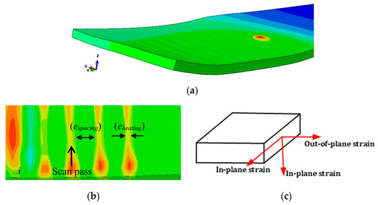 The simulated model is shown in Figure 4a. The heating and spacing strains were calculated through numerical modeling at the centers of the regions shown in Figure 4b. The in-plane strain was calculated by averaging the strains in the two perpendicular directions at the mid surface (Figure 4c), where the out-of-plane strain was also analyzed.