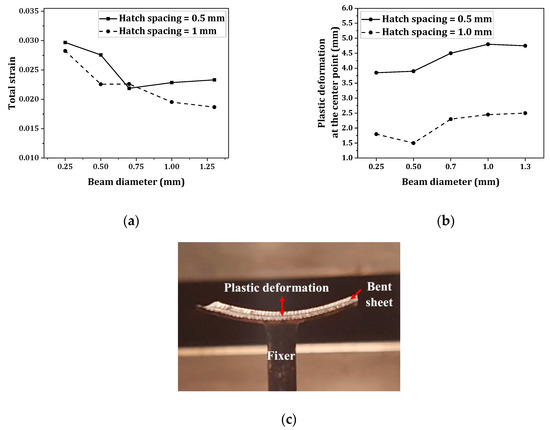 - The total plastic strain increased with a decrease in beam diameter and increase in hatch spacing. This was attributed to the increase in temperature and implied a correlation between the melting and an increase in the total strain.