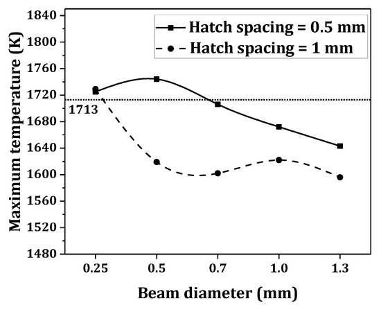 Figure 7 shows the maximum temperatures of the samples obtained by the finite element analysis. Higher temperatures were generally generated at smaller beam diameters. Considering the melting temperature of the alloy (dashed line, 1713 K), these results suggest a correlation between melting and an increase in total strain (Figure 6a).