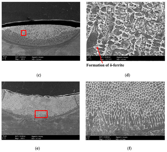 SEM images (Figure 9a–f) were acquired for a microstructural analysis. Upon the heating of the austenitic stainless steel, the face-centered cubic austenite (γ-phase) was the first phase that formed, which then transformed into the body-centered cubic ferrite (δ-phase), upon further heating [20]. The critical stress could contribute to the phase transformation by applying a load, such as the thermal load, during the laser forming process. At high temperatures, where temperature exceeded the upper band of the austenite phase transformation, i.e., 1,422 K, stress induced phase transformation took place, as high cooling rate occurred, resulting in the formation of a stress-induced martensite [21]. However, incomplete quenching could be expected due to a high cooling rate in the top layers. Therefore, the partial martensite phase transformation might have been obtained in the form of acicular martensite.