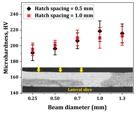 In general, the microstructure affected the hardness of the scanned track. The mean value of Vickers hardness (average of three measurements) at the top surface along the half-length of the lateral slice through the middle pass is shown in Figure 11. An increase in measured hardness was observed with the decrease in hatch spacing and increase in beam diameter. All samples exhibited hardnesses comparable to the initial hardness of AISI 316 (147.6 HV0.1). During the plastic deformation, the dislocation movement turns into dislocation accumulation when the grain boundaries act as obstacles against the dislocation flow [24]. Consequently, the stress concentration and strength of the material at the grain boundaries are increased. When the beam diameter was increased to 1.0 and 1.3, the microstructures of the heat-affected areas of the scanned tracks included equiaxed fine grains (Figure 8e,f). The microstructural results showed the larger numbers of grain boundaries in the above samples. This implied that small spherical grains were replaced with inhomogeneous austenite grains. The grain boundary strengthening effect contributed to an increase in the microhardness at the scanned track, owing to the reduction in grain size and increase in the number of grain boundaries. The relation between the hardness and the number of grain boundaries could be expressed by using the Hall–Petch equation [28].