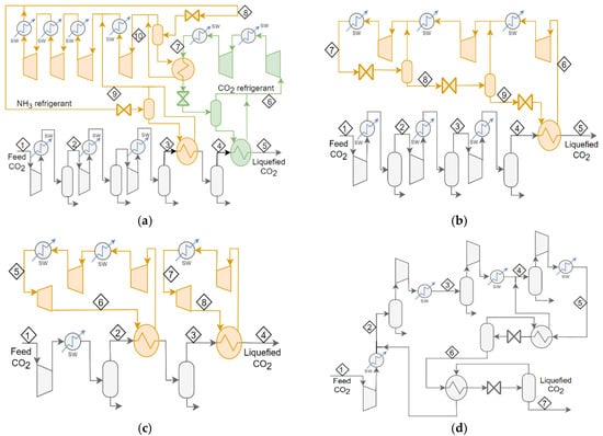 Process flow diagrams for the “base” cases for the CO2 liquefaction schemes; (a) shows Case 1, (b) Case 2, (c) Case 3, and (d) Case 4.