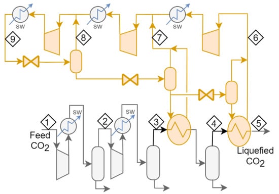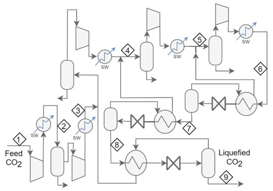 - Lee, S.G.; Choi, G.B.; Lee, J.M. Optimal Design and Operating Conditions of the CO2 Liquefaction Process, Considering Variations in Cooling Water Temperature. Ind. Eng. Chem. Res. 2015, 54, 12855–12866. [Google Scholar] [CrossRef]