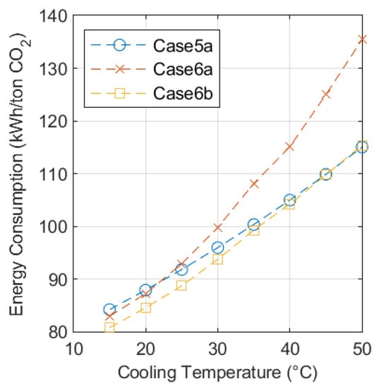 Variation in energy consumption for Cases 5a, 6a, and 6b with cooling temperature.