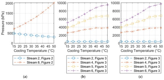 Figure 5 shows the variation in the operating pressure parameters for Cases 5a, 6a, and 6b. Again, the smoothness of the two curves gives an indication of the level of consistency achieved in the optimization process. In both cases, the inter-stage pressure of the CO2 feed compressor drops as the cooling temperature increases. This is a result of the 150 °C temperature limits, which represents the optimum condition for inter-stage pressure in all the cases shown here.