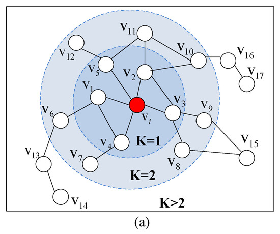 First-order proximity: It refers to the local pairwise proximity between two connected vertices, which captures the direct neighbor relationship between the vertices. For each vertex pair (, ), if , the first-order proximity between and is ; otherwise, the first-order proximity between and is 0 [4]. First-order proximity is equivalent to k in the k-order proximity equal to 1. In a) of Figure 1, nodes are the first-order proximity of .