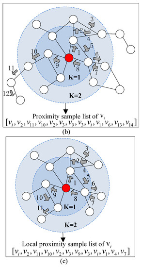 Proximity and comparison based on graph representation. The proximity sampling strategy cannot accurately characterize the local proximity features of the network packet with unlimited proximity. The local proximity sampling strategy has the ability to accurately characterize the local proximity features of the network packet when the sampling range of the source network packet is limited to a low-order proximity. Section 3.4 will introduce the detailed algorithm of graph representation learning for low-order proximity feature extraction. (a) Proximity nodes of source network packet . The red node represents the source network packet . (b) A proximity sampling strategy is used for random walk to obtain a proximity sample list of the source network packet. The number of the gray arrow indicates the order in which the sampling strategy is used for sampling. (c) A local proximity sampling strategy is used to perform a random walk of the constraint range to obtain a local proximity sample list of the source network packet.