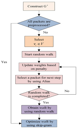 Random walk: The source network packet is , and the length of the random walk we need to simulate is l. Our goal is to generate a local proximity sample set of the source network packet . Assume that random walks are started from the source network packet , and the network packet in the random walk is . In detail, the network packet is generated by the following distribution [10].