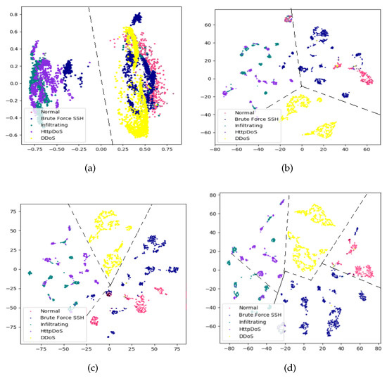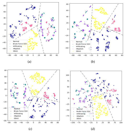 Visualization of unsupervised intrusion detection algorithms. (a) PCA algorithm. (b) Deep Auto-encoder algorithm. (c) Proposed node2vec-AE algorithm. (d) Proposed packet2vec-AE algorithm.