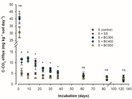 Carbon mineralization rate (CMR) of soil and sewage sludge (S + SS), soil and SS-derived biochars obtained at 300 °C (S + BC300), 400 °C (S + BC400), and 500 °C (S + BC500) pyrolysis temperature and soil (S) as the control treatment. * and ns: significative and non-significative using the Tukey test (P < 0.05), respectively.