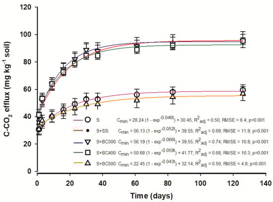 Microbial activity was higher in the first 20 to 25 days after the beginning of the incubation period and decreased over time. The higher mineralization at the beginning may be attributed to the available readily oxidizable organic C, found in the biochars produced at temperatures lower than 500 °C [20]; C-CO2 effluxes are positively correlated to SS labile fractions [41]. Once this fraction is depleted, C-CO2 effluxes are maintained constant. In general, C-CO2 effluxes were higher when the soil was mixed with biochars produced at lower temperatures (BC300 and BC400) and with SS, where there was a stimulus to C mineralization, particularly during the initial incubation phase. Differently, the biochar produced at a higher temperature (BC500) produced a similar C-CO2 efflux from the control, showing the low capacity of degradation of this biochar.