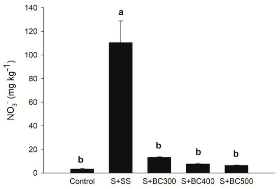 The highest nitrate (N-NO3−) levels were observed in S + SS, whereas the other treatments did not increase N-NO3− in comparison to the control (Figure 3). N-NO3− concentration decreased in the biochars with increasing pyrolysis temperature (Table 2), as a consequence of the volatilization process [2]. Although the application of biochars did not increase N-NO3− levels (available N form), total nitrogen may have not been fully available for plant absorption due to organic binding in recalcitrant compounds [45]. It is believed that biochars have the potential to render nitrates unavailable and decrease its leaching, whereas N fertilizer application to biochars and co-composting of biochars increases N-NO3− availability to plants and microbial activity [46]. Furthermore, Haider et al. [47] suggest that current N-NO3− extraction methods underestimate N-NO3− availability to microbial activity and/or immobilization.