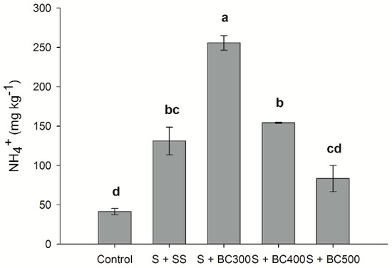 The amount of N-NH4+ in soil was found to be higher than N-NO3− contents, for all treatments. Total N-NH4+ contents were higher for the low temperature biochars, following the decreasing order: S + BC300 > S + BC400 > S + SS > S + BC500 > S (Figure 4). Total N-NH4+ increased approximately 450%, 311%, and 150% when BC300, SS, and BC500 were applied to soil compared to the control (S), respectively (Figure 4). These results indicate that, unlike N-NO3−, biochar is able to supply N-NH4+ to the soil over the short term. Biochar produced at a lower temperature (BC300) had the highest capacity to supply N-NH4+ to soil compared to BC500. N is removed in the forms of N-NH4+ and N-NO3− and through volatile matter containing N during the pyrolysis process [48]. However, with increasing pyrolysis temperatures, N forms are gradually transformed into a pyridine-like structure or converted to more stable compounds, like pyrrole-type N [49]. Similarly to our study, Hossain et al. [50] found that increasing pyrolysis temperatures from 300 °C to 700 °C decreases total N content by 55% due to the volatilization of N during the pyrolysis process. Our results also indicate that the relatively high proportion of N is conserved at lower pyrolysis temperatures; increasing pyrolysis temperature from 300 °C to 500 °C decreased N-NH4+ and N-NO3− contents by approximately 64% and 91% when applied to soil, respectively.