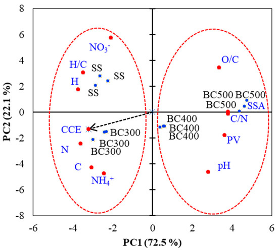 A principal component analysis (PCA) was conducted to determine the relationships between the SS physicochemical properties and the SS-derived biochar’s CCE and N-NO3−, N-NH4+ contents after applying it to soil. The following properties were used for PCA: total C (C) and total N (N), H, C/N ratio, H/C ratio, pH, N-NO3−, N-NH4+, specific surface area (SSA), pore volume (PV), and CCE (Figure 5). In general, along the first PC axis (PC1), a clear separation between two groups was observed: SS and BC300 (group 1) and BC400 and BC500 (group 2), as indicated in Figure 5. By means of PCA, it was possible to demonstrate that the higher values of CCE presented by the SS and the SS-derived biochar produced at 300 °C (BC300) were related to their following properties: N, C, H, and H/C ratio. Therefore, these materials increased soil N-NO3− and N-NH4+ availability compared to BC400 and BC500. On the other hand, increasing pyrolysis temperatures were associated with losses of organic matter and N, a decrease of H/C, and higher pH, C/N, PV, and SSA. Thus, BC400 and BC500, after 127 days of incubation, showed low soil N (NO3−, NH4+) availability. In general, the greatest contrast (highest PC1 score variations) was observed among SS and BC300 compared to BC500.