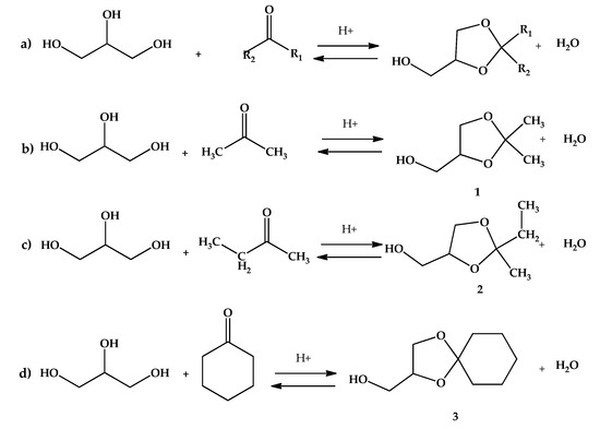 The reactions were carried out in glass reactor at atmospheric pressure. Typically, the glycerol (10 mmol), an adequate amount of ketone from 30 to 90 mmol (acetone, butanone also known as methylethylketone or MEK, or cyclohexanone) and 2 to 4 mL isopropanol were mixed in a 25 mL round bottom flask till a clear homogeneous phase was obtained. After reaching the adequate temperature (25 to 50 °C, depending on the system under study), a certain mass of the acid-activated clay AC was added (0.25 to 3 g, depending on the studied system) and stirred with a cylindrical magnetic stirrer to avoid catalyst attrition. The reactions of interest are shown in Figure 2.