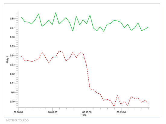 Time course as detected by Fourier Transform Infrared Spectroscopy (FTIR) at 1711 cm−1 wavenumber for the reaction of glycerol and acetone to solketal and water using isopropanol as solvent (system 1, in red dashed line) together with negative blank to show no reaction between isopropanol and acetone (in green solid line).