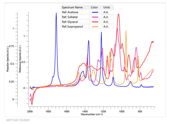Due to the low solubility of glycerol in the pure ketone, isopropanol was used as a cosolvent in the minimal amount needed to obtain a homogeneous system (2.1 mL for acetone, 3.5 mL for MEK and 4 mL for cyclohexanone—higher amounts for more hydrophobic ketone). The reactions were monitored online with ReactIR 10 equipment (Mettler-Toledo, Columbia, SC, USA), based on FTIR spectroscopy, that is able to provide all the organic chemical species that are present in the solution as the reaction is being performed [36]. The FTIR spectrometer uses a mercury-cadmium telluride (MCT) detector that is cooled by liquid nitrogen and measurements are optically taken using a diamond-tipped probe with a 1.5 m long fiber-optic conduit. Data acquisition was performed from 2000 to 650 cm−1 with a 4 cm−1 nominal resolution. In Figure 3, an example of a reaction of acetone (60 mmol) and glycerol (10 mmol), using isopropanol as cosolvent (2.1 mL) is shown (System 1). In contrast, a blank using the aforementioned volume of isopropanol and the said molar amount of acetone is also presented. The signal at 1711 cm−1 wavenumber is selected in this case and in the other runs as it is an isolated peak in all FTIR spectra that can be used to follow the disappearance of any ketone (with some shift depending on the ketone under study). This peak is due to the C = O stretch and its isolation can be easily perceived in Figure 4, where, as an example, all relevant FTIR spectra for the main components of system 1, with the exception of water, are displayed.
