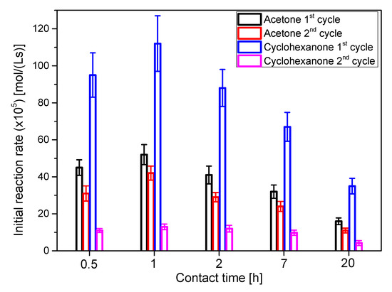 Activity and stability tests were performed using acetone and cyclohexanone as ketones to obtain the corresponding ketals 1 and 3. Common conditions were the molar ratio ketone/glycerol, set at 6, and the catalyst concentration in all cases, set at 50 g/L. Due to the lower volatility of cyclohexanone, 40 °C was the temperature chosen for this reacting system, while 25 °C were selected for acetone reactions. Therefore, the differences of initial reaction rate can be ascribed, at least partially, to the reaction temperature. Values of this variable, in Figure 5, indicate that the best contact time values are 0.5 and 1 h, with a decrease in the activity for higher contact times. Stability was similar for all contact times. The difference comes between the two reacting systems: much more activity is maintained for the acetone system or system 1, probably because glycerol can be much easily washed in a more polar liquid reacting phase. It is interesting to observe that almost double isopropanol is needed when using cyclohexanone to obtain a homogeneous reacting system, with an increased probability that non-reacted glycerol (about a 20% of the initial one) adsorbs onto the tested clays, resulting in the subsequent deactivation by fouling [37].