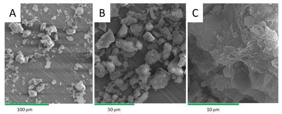 After a careful drying process due to the hygroscopic nature of the samples, SEM microscopy allows for the observation of the texture of the clay and the physical characterization of mineralogical assemblages. The images obtained by SEM of the clay with different magnifications are shown in Figure 8. Clay is in the form of fine aggregates and platelets in the form of rods. It can be seen in the poorly crystallized kaolinites and illites, as observed by Fatimah et al. [22]. The images are consistent with previous XRD results which show the presence of carbonates and quartz. Carbonates (calcite) are in the form of highly visible aggregates while quartz is in the form of small grains [23,24]. The images show a sheet structure of the clay. In Figure 8A, with a magnification of 500×, the clay presents different grain sizes. With a magnification of 1000× (Figure 8B), an assembly of aggregates of different shapes and oriented towards different directions were observed. The magnification of our sample at 5000× (Figure 8C) shows that the clay has the form of exploded sheets.