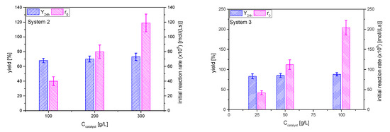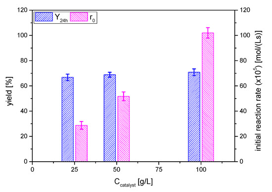 The effect of catalyst dosage on solketal yield was investigated by varying acid activated clay AC concentration, selecting the values 25, 50 and 100 g/L and keeping constant the other reaction parameters: 6/1 acetone/glycerol molar ratio at room temperature 25 °C for 24 h. The yields to the ketal and the initial overall reaction rate are displayed in Figure 9.