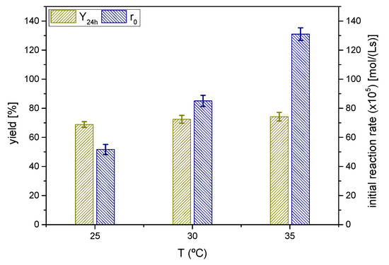 The effect of the reaction temperature was investigated at three different, and moderate, temperatures from 25 °C to 35 °C as shown in Figure 10.