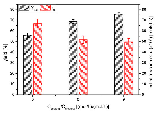 One of the classical strategies to shift the equilibrium position towards the products is to increase the molar excess of one reagent [17]. In this case, due to the interest in the full conversion of glycerol and the easy recovery of acetone, the acetone excess was studied. Therefore, three runs (in duplicate, as it has been the usual way in this work) were performed, selecting the acetone/glycerol molar ratio values of 3, 6 and 9. As shown in Figure 11, the yield to solketal increased from ~65 up to ~75% when the excess of acetone increased from 3 to 9; in fact, fitting yields to a rectangular hyperbola permits us to conclude that increasing acetone excess up to infinitum will not totally shift the equilibrium position towards the products (the equilibrium position at infinite acetone seems to be 92%, approximately). This fact could be explained if deactivation of the catalyst AC is present, as has been shown in the catalyst selection (Section 3.1).