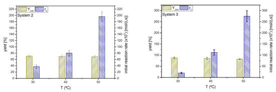 As in the previous sections, yields of ketals 2 and 3 at 24 h and initial rates for the ketalization reaction are shown in Figure 13. It can be appreciated that the temperature affects the ketalization initial rate in an exponential manner (Arrhenius). The effect on r0 is more pronounced for cyclohexanone, seemingly with a higher activation energy than the MEK-glycerol ketalization.
