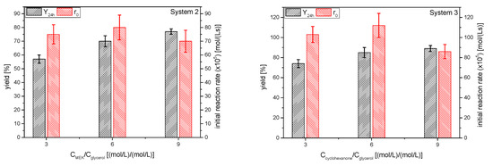The influence of molar ratio of the ketones to glycerol resulted in yields to the corresponding ketals 2 and 3 at 24 h and initial reaction rates that are displayed in Figure 14. The overall trend in the initial reaction rate as the excess of the ketone increases is not clear, but it is decreasing somewhat, as can be expected when the product of the reagents concentrations is reduced by 14%. The effect on the ketal yield with increasing ketone excess, as expected, is the increment of this parameter. Fitting yields at equilibrium to rectangular hyperbolas resulted, as in the case of solketal, in a value lower than 100% (about 92–95%), showing that the complete shift of the equilibrium towards the products is not possible, supporting in this way the hypothesis of deactivation, a phenomenon that happens, at least, when using strong acid exchange resins [39].