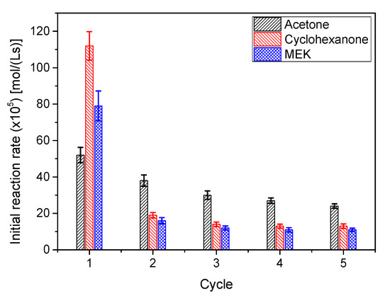To check how the catalyst AC is deactivated during ketalization, and considering that the majority of ketal production happened in the first hour, several short reaction cycles of 50 min were performed for all systems. The results, in terms of initial reaction rate (ketalization), are collected in Figure 15. The evolution of r0 between cycles indicates that the catalyst deactivates following an exponential trend towards a stable, but less active, catalytic species. Though less evident, it happens also in other ketalization systems, where the catalyst seems to be less prone to deactivation, but, again, a certain stabilization is observed after a few cycles [35]. This behavior is typical of a heterogeneous catalyst that contains two or more types of active centers with different stabilities or catalysts that are partially blocked during the reaction process [42,43].