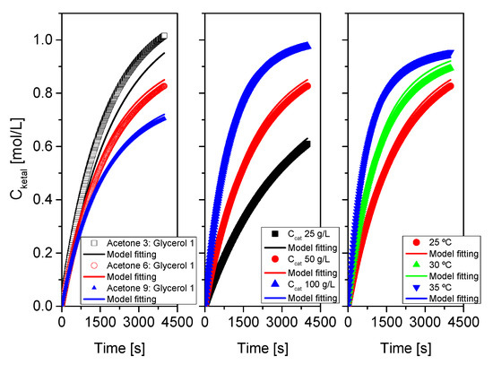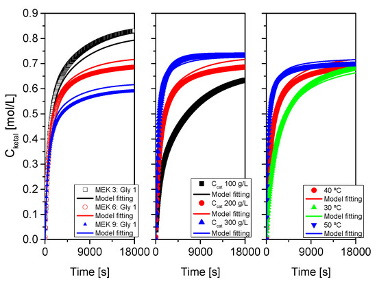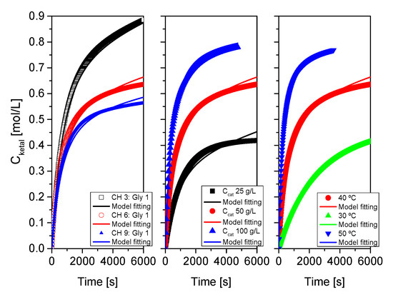 As indicated at the beginning of this section devoted to results and their discussion, the proposed kinetic model was fitted, for each system, to each run, to runs where one of the variables was changed and to all runs at the same time. Results of this last fitting for all systems are collected in Table 3 and Table 4 and in Figure 16, Figure 17 and Figure 18. Table 3 collects statistical parameters related to the goodness of the fit of the model to all data for each system. In all cases, the values of SSR and RMSE are really low, given the high number of data (N), indicating a close fit of the model to all data (this can be even better observed in the figures). Again, very high values of Fisher F at 95% confidence, much higher than the threshold values at that level of confidence (typically in the range 20–100) show that the model is adequate, so the hypotheses behind it seem acceptable, and the fit of the model to data for any of the systems is correct. Finally, the percentage of variation explained (VE) is near 100%, so, again the predicted temporal evolution rate for the ketal is very similar to the experimental one.