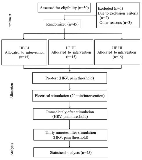 This study involved a parallel design to compare the means of three groups, and the analysis method used for the main evaluation variables was a two-way repeated measures Analysis of Variance (ANOVA). We included 45 healthy students living in Kwangju city, Republic of Korea, in the study. The participants were provided with sufficient explanation about the study, and all voluntarily agreed to participate in the experiment. The sample size was estimated from power calculations using a commercially-available software package (G-Power). Assuming a power of 90%, a type 1 error (α) of 5%, a type 2 error (β) of 10%, and a confidence interval of 95%, we calculated a sample size of 15 per group [20,21]. Exclusion criteria were as follows: Medical history and vital signs (blood pressure, pulse, body temperature, respiratory rate) that may be associated with changes in blood flow; conditions that may influence the blood test and experimental results; metal prosthetic implants; neurological or brain disorders; and unsuitability for electrical stimulation intervention or other. In order to control for factors that may influence the results, the participants were instructed to refrain from vigorous exercise that may influence their heart rate variability (HRV). They were also required to abstain from smoking and the drinking of alcohol and coffee, which may influence the autonomic nervous system (ANS), 1 h prior to the experiment. In addition, the participants were given instructions about other factors that may affect the results (e.g., talking, coughing and deep breathing), and were requested to avoid such behaviors during the measurements. Preliminary measurements were conducted, and subjects who had a large HRV that deviated from the standard value due to excessive sweating on the palms, or cold hands, were excluded. The participants were randomly assigned to receive high frequency-low intensity (HF-LI), low frequency-high intensity (LF-HI), or high frequency-high intensity (HF-HI) electrical stimulation (n = 15 per group). For the analysis, the three groups were considered to have similar general characteristics (Table 1).