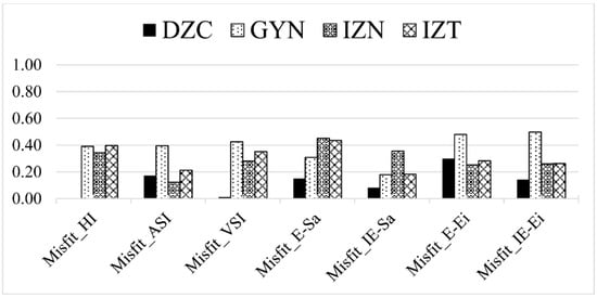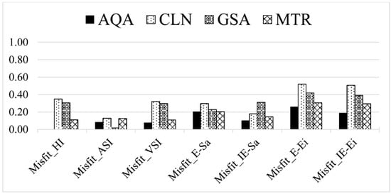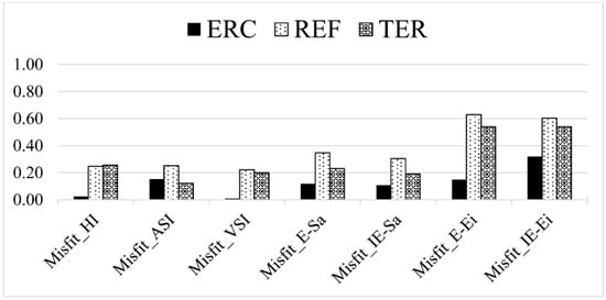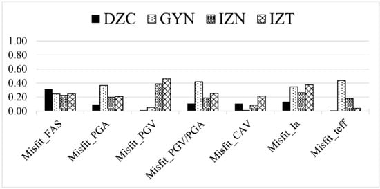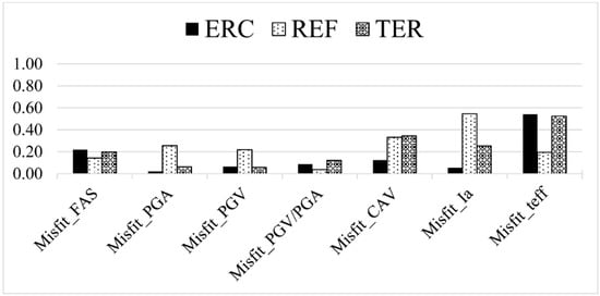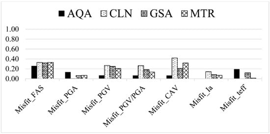 For calculation of all seismological log-scale misfits, the geometric mean of the seismological parameters from the observed records in NS and EW directions at every station for each case study is considered. The results of station-wise seismological log-scale misfits for all study regions are illustrated in Figure 4, Figure 5 and Figure 6. These illustrations reveal that for all case studies, the overall log-scale misfits are less than 1, in log-scale. However, depending on the study area and station, there is variability in terms of seismological log-scale misfits corresponding to alternative seismological measures. Next, for each station in each study area, the average seismological log-scale misfits are calculated by averaging the individual log-scale misfits in terms of and (including PGA, PGV, PGV/PGA, CAV, and ). The results are presented in Table 4. For Erzincan, as the first case study, among all selected three stations, the least log-scale misfit is obtained for station ERC which is located in the closest distance to the fault plane. The same observation is valid for Duzce and L’Aquila as the second and third case studies, since the least average log-scale misfits are obtained for stations DZC and AQA located in the nearest vicinity of the fault planes.