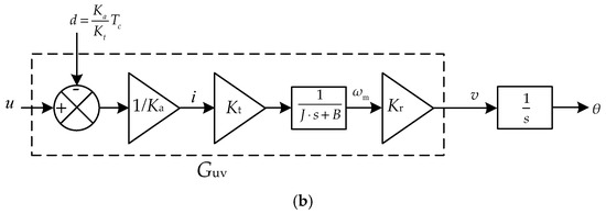 Considering that the cut-off frequency of the current loop is much larger than the working frequency of the OES, the current loop of model (2) can be equivalent to a proportional component. Then, convert the Coulomb friction torque Tc to the input portion, i.e., , and a simplified speed open-loop dynamic model can be obtained, as is shown in Figure 2b. The corresponding transfer function is: