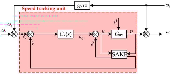 The schematic diagram of the control algorithm proposed in this paper is shown in Figure 3. The input is the inertial reference speed , and the output is the actual inertia speed of OES. The module SAKF represents the state-augmented Kalman filter, and the torque disturbance d is observed and compensated based on the voltage u and the rotational speed v differentiated by the encoder. Meanwhile, the SAKF also filters the speed v to obtain a speed estimation result with a higher SNR for feedback control. The Cv(s) module is a feedback controller. The above control modules SAKF and Cv(s) constitute a speed tracking unit, as shown in the red dashed box in Figure 3. The gyro is then mounted on a carrier with its sensitive axis parallel to the rotational axis for sensing the inertial rotation of the carrier. If the actual speed of the carrier in the inertial space is and the output of the gyroscope is , then . In this case, the difference between the reference speed and is used as the reference speed vr of the speed tracking unit, and then the stable pointing of the OES in the inertial space can be realized. So in this controller, the voltage u is the manipulation variation, rotational speed v is the controlled variation, and the reference speed vr is the setpoint variation.