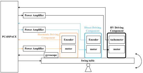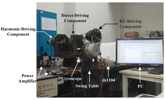 In order to verify the effectiveness of the control algorithm, an experimental setup comprised of a ds1104 [17], a power supply equipment, a swing table, a gyroscope, and three transmission components is built, as shown in Figure 4 and Figure 5. The swing table is controlled by the ds1104 to simulate the flight of aircraft. Meanwhile, the transmission components (i.e., a direct-driving component, a harmonic-driving component, and a RV-driving component) and the gyro are mounted on this swing table. Each component consists of a motor, an encoder or a tachometer, and a reducer. The main attributes of these components are listed in Table 1. Meanwhile, both the system and controller parameters of the components are listed in Table 2.