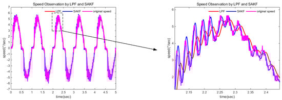 As can be seen from Figure 8, the noise from the original speed signal is evidently reduced by both the SAKF and LPF. However, the speed from the LPF has a significant delay, while the delay of the speed estimated by the SAKF is almost negligible. Therefore, comparing with the LPF, the SAKF has a better speed observation performance.