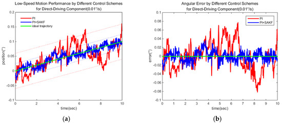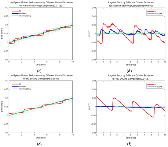 The PI control method and the proposed composed control method respectively perform speed closed-loop control on the direct drive component, the harmonic drive component, and the RV drive component. Keep the swing table still and set the reference speed vr to 0.01°/s, then collect the encoder data and plot the angular position value. The typical curve is shown in Figure 9. In Figure 9a,c,e, the red slash represents the motion trajectory envelope when using PI, the blue slash represents the motion trajectory envelope when using the PI + SAKF. Meanwhile, the solid red line represents the actual trajectory by the PI, the solid blue line represents the actual trajectory by the PI + SAKF, and the green line represents the ideal trajectory without any tracking errors. Figure 9b,d,f show the tracking error of the three components when using the PI and the PI + SAKF as the control scheme respectively.